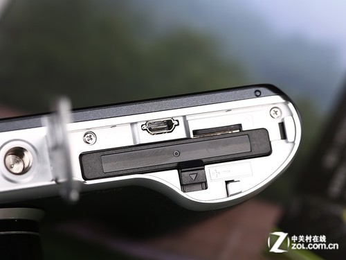 然后我们来看看细节接口部分,三星GC200很多地方都与手机有着很高的相似之处,当然了闪光灯为了控制体积依旧采用了内藏式设计,不过设计和之前的GC100完全不同,弹起后会向前伸出。而结构也更加精密(可视效果更好)。由于新闪光灯的结构设计,笔者尝试着进行了跳闪,发现完全向上抬起是无法实现闪光的,不过接近60°度的倾斜调整还是没有问题的(注:此属特殊玩儿法,并非官方支持,朋友们购买相机后须谨慎尝试)