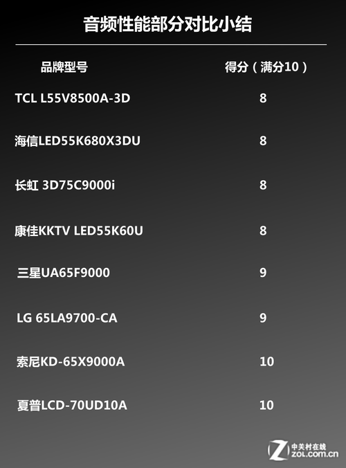 ● 音频性能对比 除了屏幕色彩效果之外,音频性能也是很多用户比较在意的,不过之前很多消费者都会有一个误区:扬声器功率越大越好,他们会倾向于选择扬声器功率大的电视产品,但实际上音质与功率并不是绝对的正比关系。这里我们也邀请了我们的音频频道编辑对这八款液晶电视的音响效果进行打分。本轮测试环节完全采用主观视听的方式。