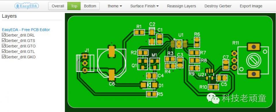 下载下来的Gerber文件中,已经包含了钻孔文件。 gerber文件浏览工具 电路板加工厂就是按照gerber文件加工的,所以,我们在把gerber文件发给厂家之前,最好还是要检查一下文件是否正确。 EasyEDA提供了在线gerber文件浏览器,刚才下载gerber文件的那个按钮的旁边有一个Gerber viewer链接,点击一下就打开了。 刚打开,默认情况下,所有文件都是勾选的。和众多的gerber浏览工具一样,我们可以把不需要的勾去掉,留下想看的那个文件,如下图所示: 与众多gerber文件浏览工具不同的是,EasyEDA这款,显示出来的比较接近实物,而且还可以更换蓝色、红色和黑色等颜色。 更多姿势,你还是亲自操作一下进行解锁吧! 不过,相比于那些收费高昂的画图软件来说,EasyEDA还有很多功能没有实现,让我们给EasyEDA团队更多的时间,把EasyEDA越做越强大。(这可是国产软件哦!) 科技老顽童,一个免费分享电子经验的地方,不想错过点滴分享,就关注我吧