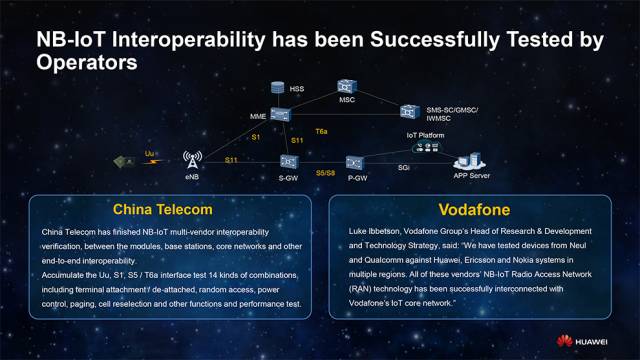 Vodafone表示已完成不同终端与不同厂家的网络设备间的连接测试,NB-IoT无线接入网成功与物联网核心网互连。